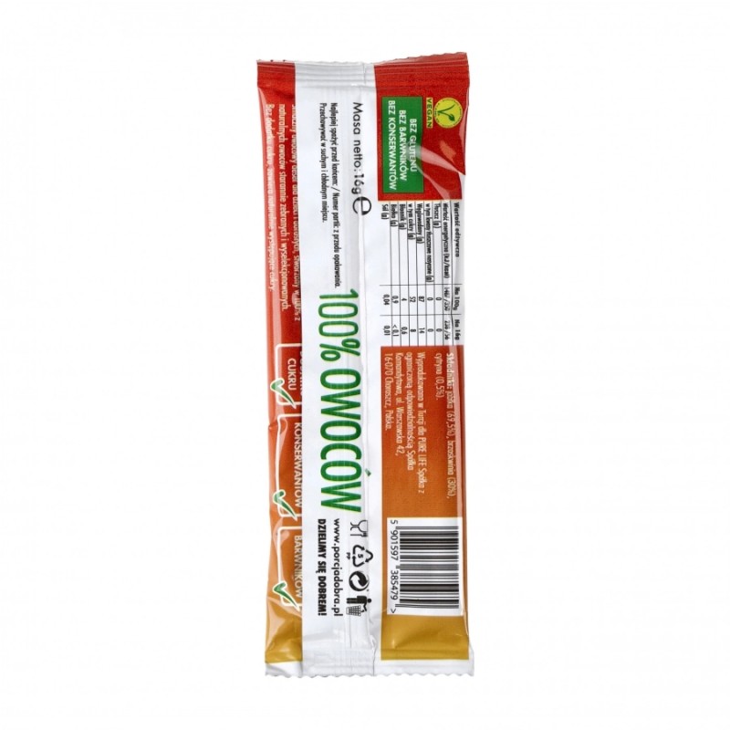 Przekąska zawiera jedynie naturalne cukry, a forma listka ważącego jedynie 16 g zapewnia możliwość łatwego przenoszenia.