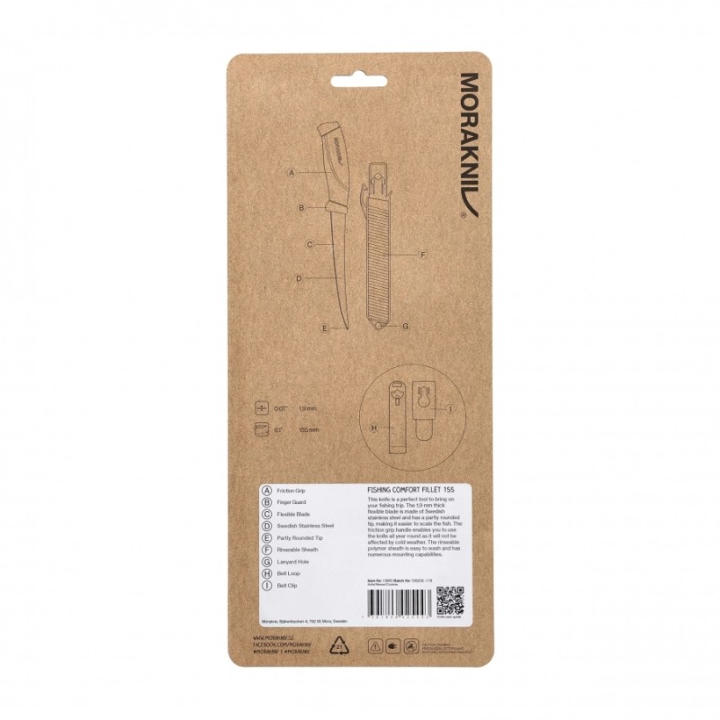 Profilowana rękojeść z gumy zapewnia pewny i wygodny chwyt, zapobiega wyślizgiwaniu się noża podczas pracy, nie przewodzi także zimn, dzięki czemu Morakniv Fishing Comfort Fillet 155 zapewnia komfort pracy przez cały rok. Do bezpiecznego noszenia noża na pasie służy polimerowa pochewka z blokadą. Do pochewki dołączone są 2 montaże: w formie klipsa oraz szlufki na pas.