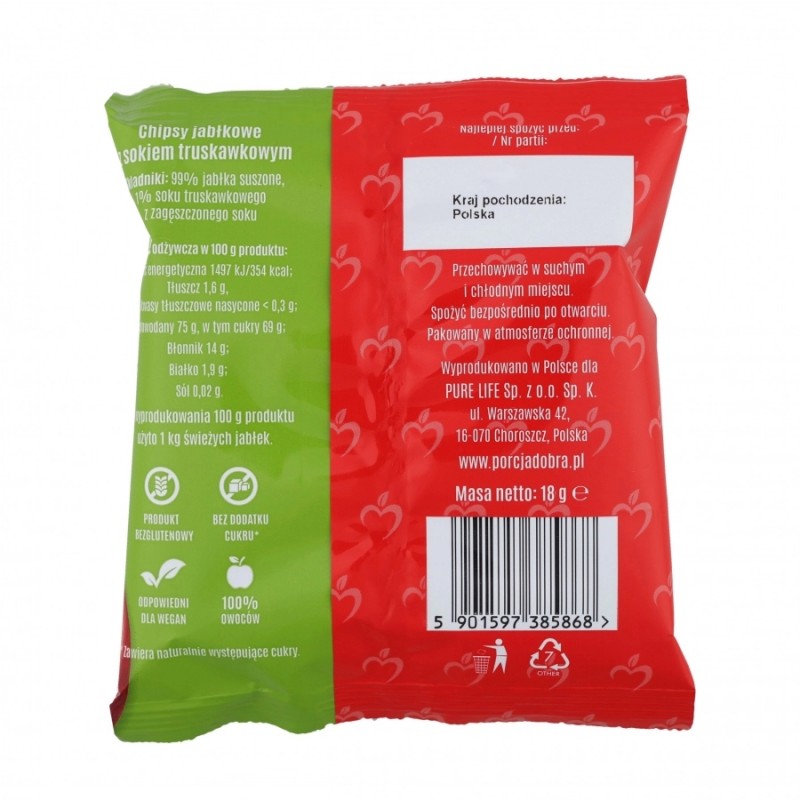 Porcja Dobra o smaku truskawkowym to naturalne i chrupiące chipsy z jabłek o masie 18 gramów, nasączone sokiem truskawkowym. Ta niskotłuszczowa i lekka przekąska bez dodatku cukru oraz konserwantów będzie idealnym rozwiązaniem na wyprawy turystyczne, do pracy, na trening, szkoły czy do kina. Bogate w błonnik plasterki owoców stanowią wartościową alternatywę dla klasycznie smażonych ziemniaków, która będzie idealna dla dzieci i dorosłych. Poręczne opakowanie sprawia, że przekąski Porcja Dobra możesz bez problemu przenosić w kieszeni, torbie czy plecaku.
