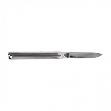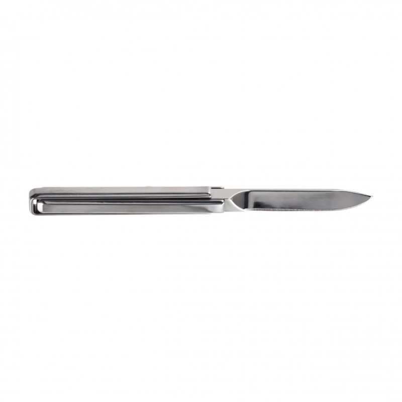 Chwyt noża CUBE to dwa stalowe elementy, które zostały połączone ze sobą w miejscu, gdzie stykają się z ostrzem. Złożenie noża może stanowić pewną formę ciekawej łamigłówki, jednak przy odrobinie wprawy nie będzie to stanowić większego problemu. Co ważne, krawędzie zostały tak wyprofilowane, aby nie haczyły o elementy odzieży lub wyposażenia oraz nie powodowały zranienia użytkownika.