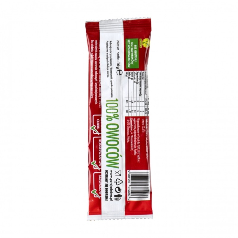 Przekąska zawiera jedynie naturalne cukry, a forma listka ważącego jedynie 16 g zapewnia możliwość łatwego przenoszenia.