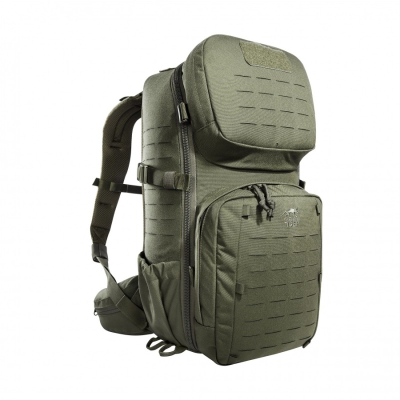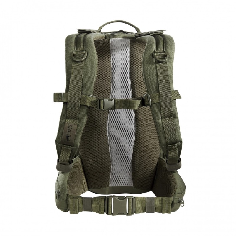 Tylny panel plecaka został wyposażony w ergonomiczną wyściółkę z pianki oraz elementy wzmacniające z aluminium, które można indywidualnie dopasować do sylwetki użytkownika. Regulowane, miękko wyściełane szelki umożliwiają wygodne noszenie plecaka również na kamizelkach balistycznych. Pas piersiowy oraz wyjmowany pas biodrowy z bocznymi kieszeniami stabilizują plecak i pozwalają równomiernie rozłożyć ciężar, minimalizując zmęczenie podczas długiego użytkowania.