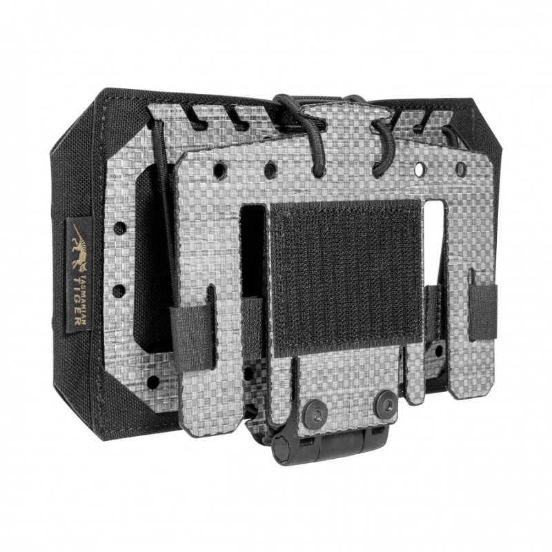 Kieszeń Tasmanian Tiger powstała z Cordury 700D oraz innowacyjnego materiału termoplastycznego Tegris (to zaawansowany, lekki kompozyt termoplastyczny produkowany przez firmę Milliken, składający się ze sprasowanych warstw specjalnych włókien polipropylenowych) w 12 warstwach, co zapewnia wyjątkową odporność na przetarcia, uderzenia i warunki atmosferyczne. Połączenie tych materiałów stabilizuje delikatną elektronikę telefonu i chroni ją przed uszkodzeniami mechanicznymi, nawet podczas intensywnych działań w trudnym terenie. Ergonomiczny mechanizm składany pozwala jednocześnie na regulację siły docisku, co sprawia, że smartfon pozostaje pewnie zamocowany, niezależnie od ruchu lub nierównego podłoża.