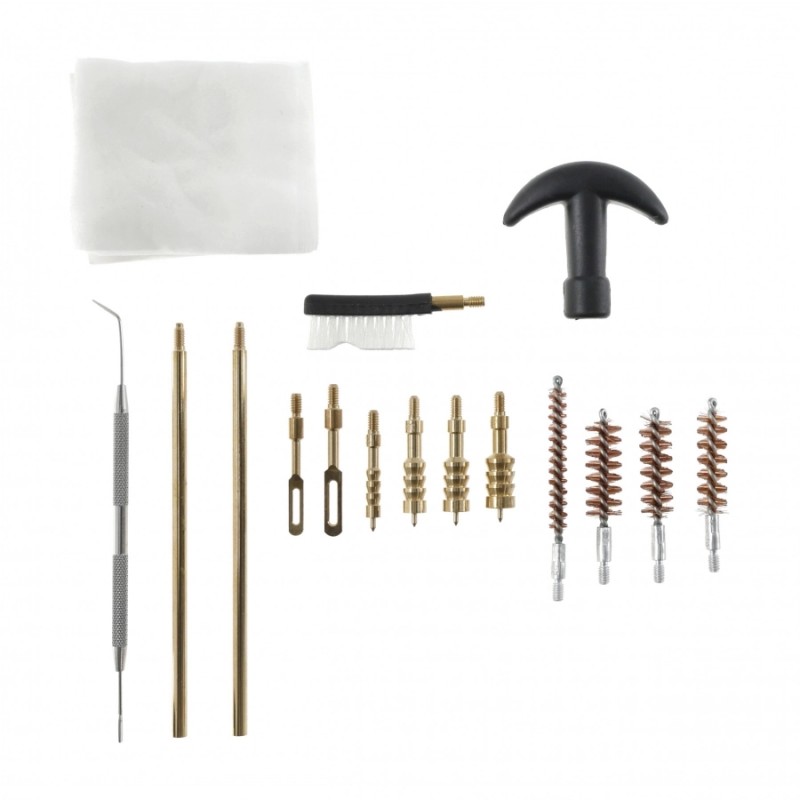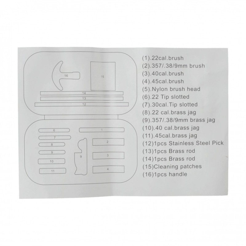 W zestawie znajdziesz solidne, skręcane pręty czyszczące z mosiądzu o długości 135 mm, które po połączeniu tworzą wygodny i stabilny wycior. Uniwersalny uchwyt, szczotka nylonowa oraz stalowy hak czyszczący umożliwiają dokładną konserwację nawet trudno dostępnych elementów pistoletu.