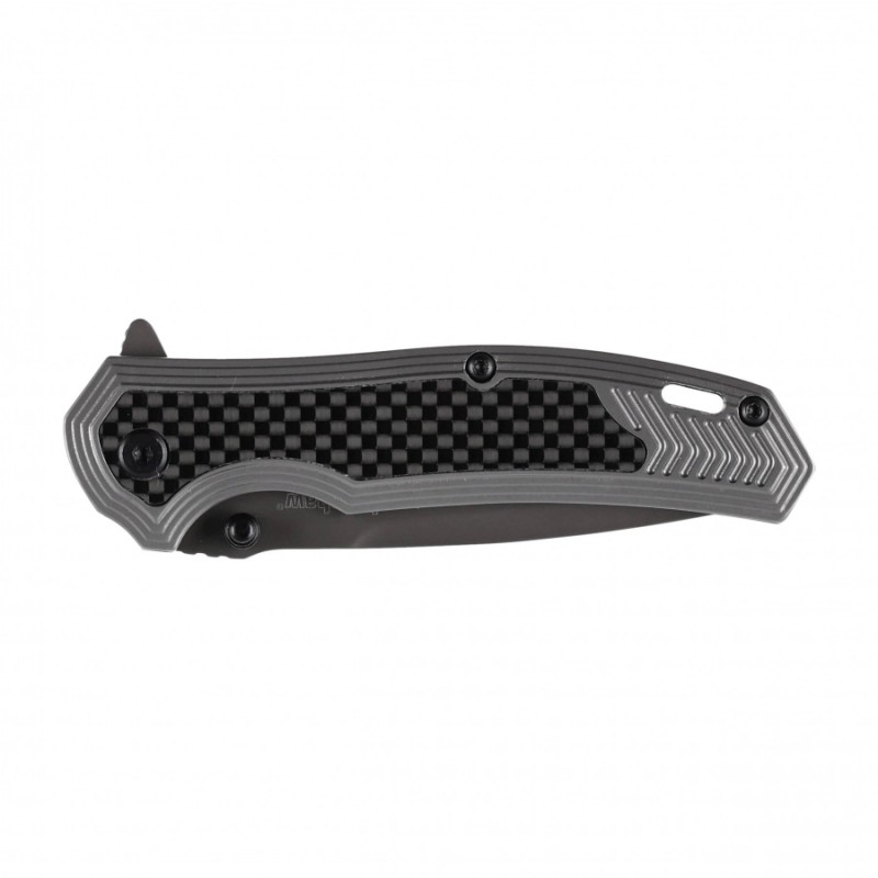 Elementem przyciągającym uwagę miłośników noży jest ozdobna wkładka z włókna węglowego, które nadają eleganckiego charakteru i doskonale współgra z kolorystką głowni. W tylnej części rękojeści znajduje się otwór pozwalający na mocowanie linki lub oplotu z paracordu.