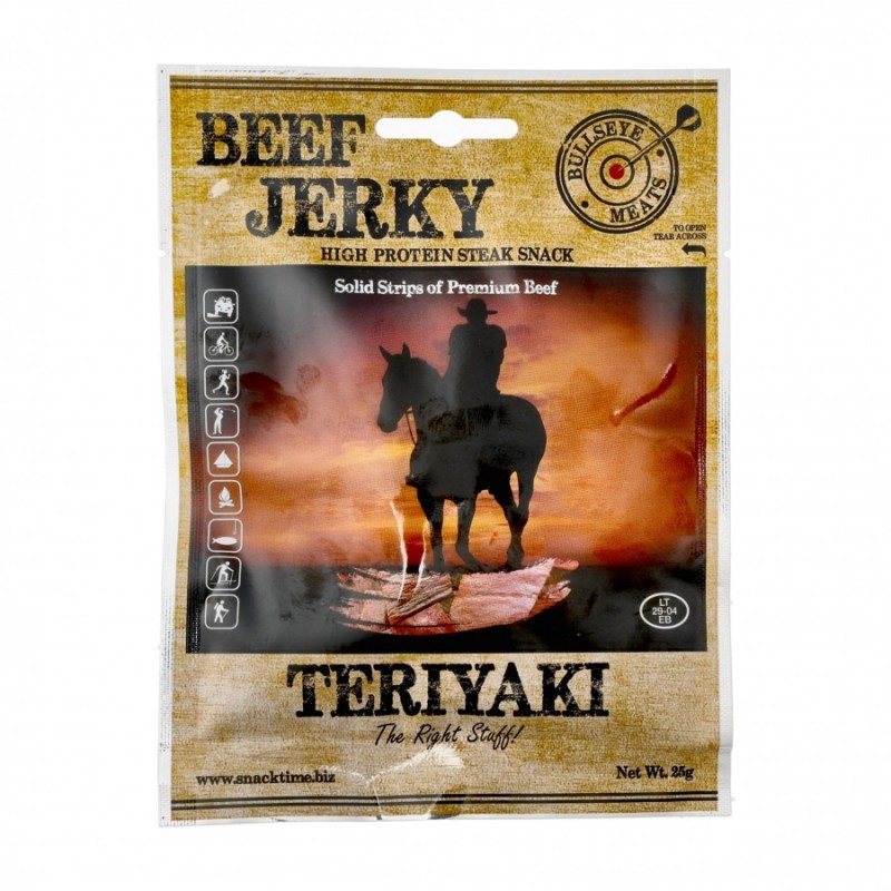 Suszona wołowina Bullseye Meats Beef Jerky Teriyaki o wadze 25 g to idealna przekąska dla osób prowadzących aktywny tryb życia. Dzięki zastosowaniu unikalnych marynat charakteryzują ja wyjątkowy, wyrazisty smak.