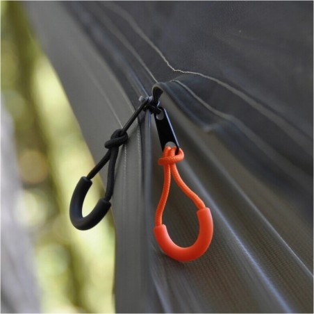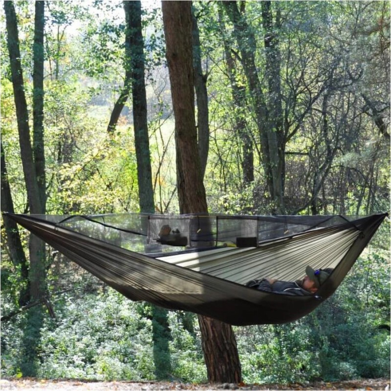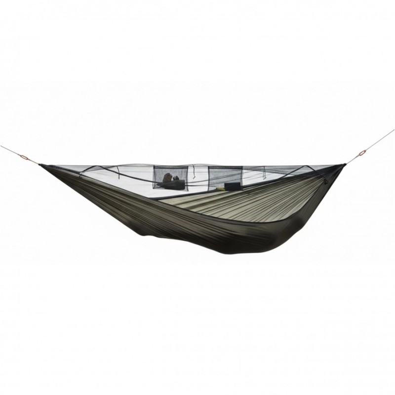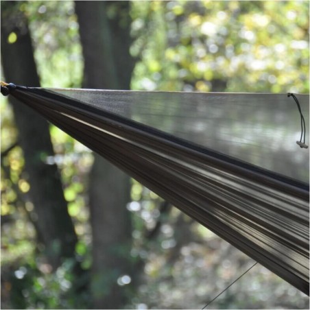 Konstrukcja hamaka została zaprojektowana z myślą o maksymalnej funkcjonalności. Wbudowana na stałe cięciwa pomaga w prawidłowym ustawieniu hamaka oraz poprawia ułożenie ciała podczas leżenia. Na jej wysokości znajdują się praktyczne kieszenie, w których można przechowywać telefon, latarkę lub inne drobne przedmioty potrzebne pod ręką. Zintegrowana moskitiera z gęstych oczek skutecznie chroni przed nawet najmniejszymi owadami, a wejście rozpinane na całej długości z obu stron pozwala wygodnie wchodzić i wychodzić z hamaka.