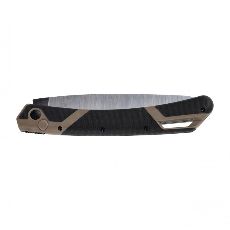 Rękojeść piły Kershaw Taskmaster Saw 2 wykonana została z wysoce odpornego na uszkodzenia kompozytu. Trwały nylon zbrojony włóknem szklanym jest nie tylko odporny na uderzenia, ale gwarantuje również odpowiednią sztywność przy zachowaniu niskiej masy. Na powierzchni rękojeści naniesiono gumową powłokę z teksturowaniem, gwarantujące pewny chwyt niezależnie od warunków otoczenia. Łatwa w jednoręcznej obsłudze blokada typu push button gwarantuje komfortowe rozkładanie i składanie piły.