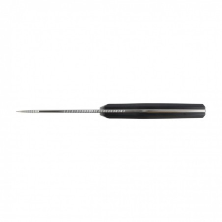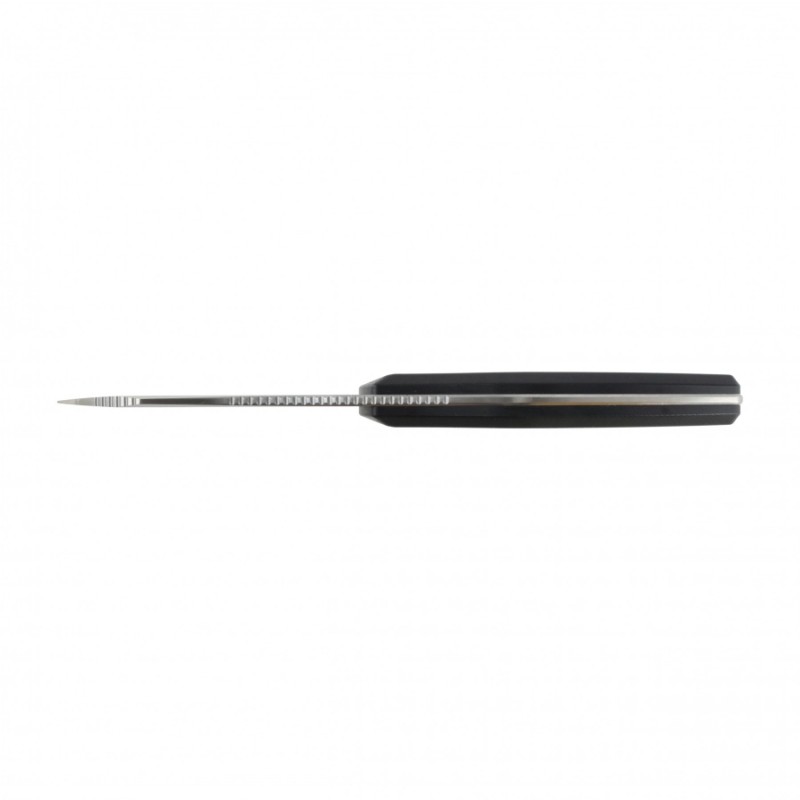 W nożu zastosowano elegancką rękojeść z tworzywa G-10. Jest to wytrzymały i lekki kompozyt wykonany z laminatu szklano-epoksydowego. Charakteryzuje się wysoką odpornością na wilgoć, chemikalia i ekstremalne temperatury. Dodatkowo teksturowana powierzchnia przekłada się na pewny chwyt, co dodatkowo zwiększa kontrolę nad nożem podczas użytkowania.