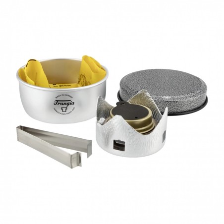 Sercem zestawu jest wydajny, mosiężny palnik spirytusowy (moc ok. 1000 W), który w połączeniu z osłoną przeciwwiatrową podgrzewa stabilnie i oszczędnie posiłek oraz żywność turystyczną. Aluminiowe naczynia w postaci garnka i patelni równomiernie rozprowadzają ciepło, a dołączony uchwyt ułatwia bezpieczne przenoszenie gorących naczyń.