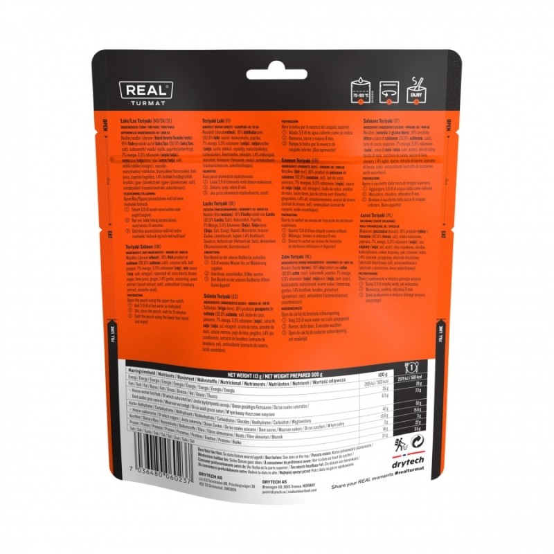 Żywność liofilizowana Real Turmat Łosoś Teriyaki 500 g to propozycja dla tych, którzy nawet w terenie nie chcą rezygnować z wyjątkowego smaku i jakości. Inspirowany kuchnią azjatycką posiłek łączy delikatnego łososia, makaron oraz aromatyczne dodatki, takie jak mleko kokosowe, mango i edamame, tworząc harmonijną, lekko słodką kompozycję z nutą sosu teriyaki. To coś więcej niż zwykła przekąska turystyczna – to pełnowartościowy posiłek, który pozwala na chwilę kulinarnej przyjemności nawet z dala od cywilizacji.
