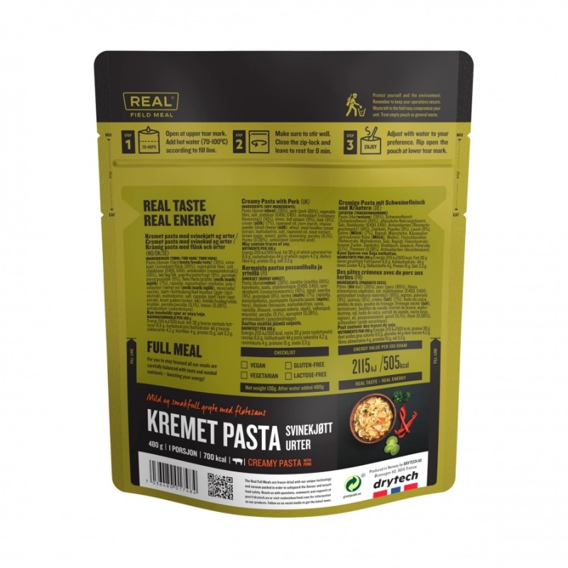 Żywność liofilizowana Real Turmat Field Meal Kremowy makaron z wieprzowiną 480 g to prawdziwie sycący, treściwy posiłek, który daje poczucie komfortu nawet w surowych warunkach. Delikatny makaron w kremowym sosie połączony z aromatyczną wieprzowiną tworzy danie, które smakuje jak solidny obiad po długim dniu wysiłku. To żywność turystyczna dla tych, którzy potrzebują maksymalnej energii i konkretnej porcji kalorii, by iść dalej bez kompromisów.