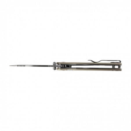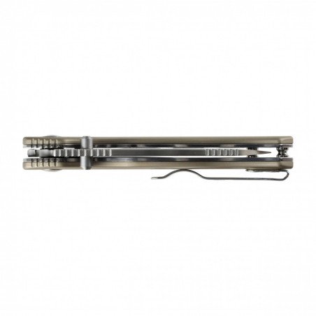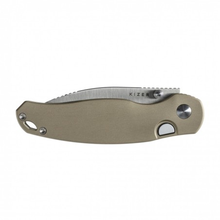 Rękojeść Kizer Phoca wykonano ze zmatowionego aluminium w kolorze szarym. Wygładzone krawędzie okładzin poprawiają pewność uchwytu i sprawiają, że nóż dobrze leży również w śliskich lub mokrych dłoniach. Na końcu rękojeści znajdziesz klips do wygodnego noszenia w kieszeni oraz otwór na smycz lub linkę z paracordu.