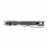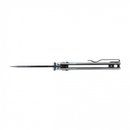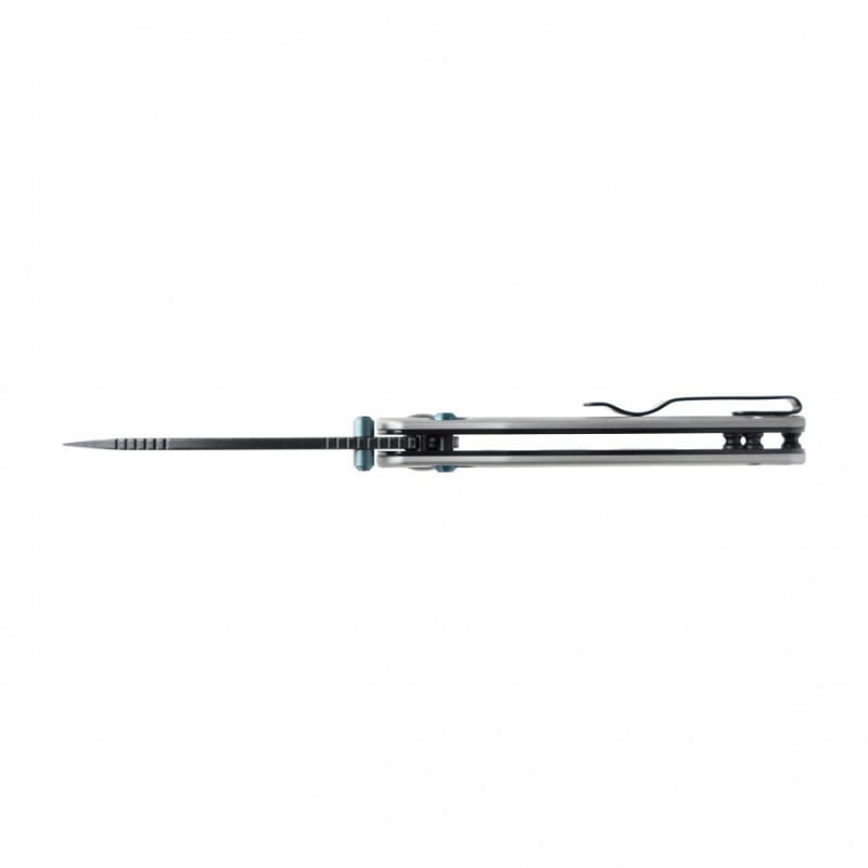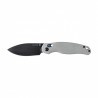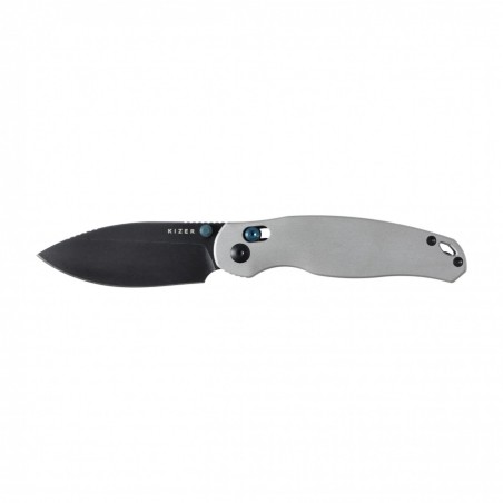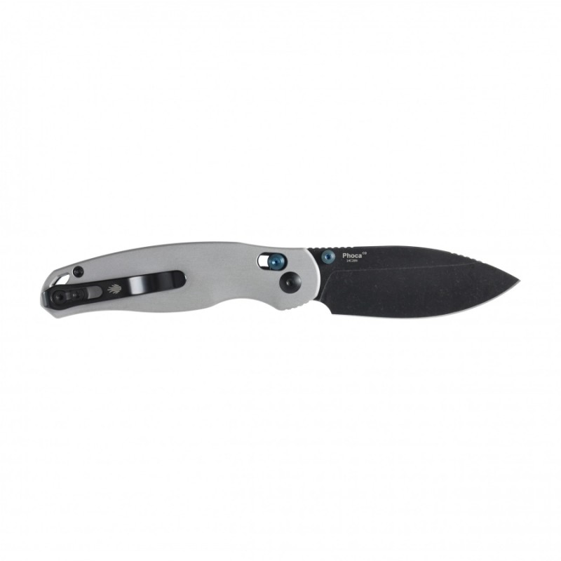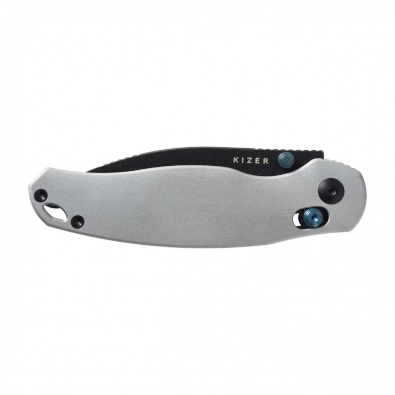 Rękojeść Kizer Phoca wykonano ze zmatowionego aluminium w kolorze szarym. Wygładzone krawędzie okładzin poprawiają pewność uchwytu i sprawiają, że nóż dobrze leży również w śliskich lub mokrych dłoniach. Na końcu rękojeści znajdziesz klips do wygodnego noszenia w kieszeni oraz otwór na smycz lub linkę z paracordu.