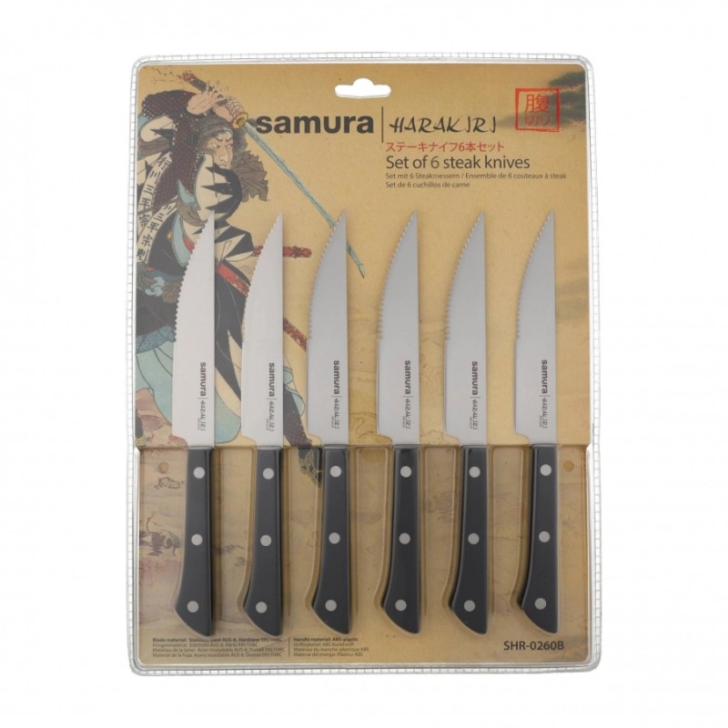 Noże kuchenne z linii Harakiri to łączące w sobie funkcjonalność z przyjemną dla oka estetyką modele zaprojektowane przez producenta Samura. Ergonomiczne rękojeści posiadają okładziny z wytrzymałego tworzywa ABS, dzięki czemu są nie tylko komfortowe, ale również niezwykle łatwe w utrzymaniu w czystości. Zestaw sześciu noży do steków, który zagwarantuje nam możliwość wygodnego krojenia wymagającego mięsa dzięki ząbkowanej krawędzi tnącej.