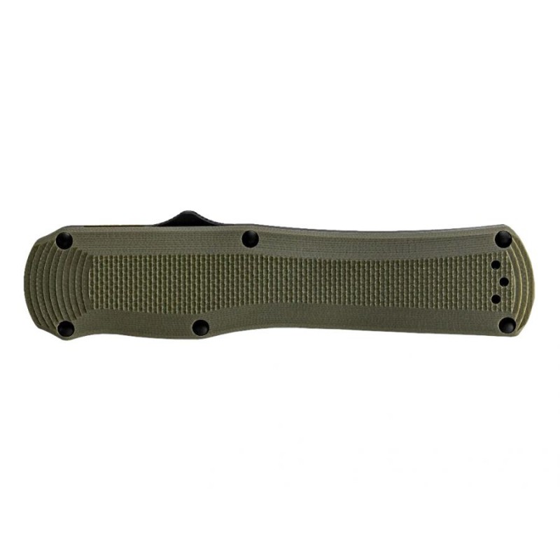 Komfort oraz łatwość operowania nożem zapewnia rękojeść wykonana z frezowanego laminatu G-10 w kolorze zielonym. Chwyt ma profilowany kształt, jego powierzchnię poddano radełkowaniu, co gwarantuje doskonałą przyczepność do dłoni oraz zapobiega wyślizgnięciu się noża.