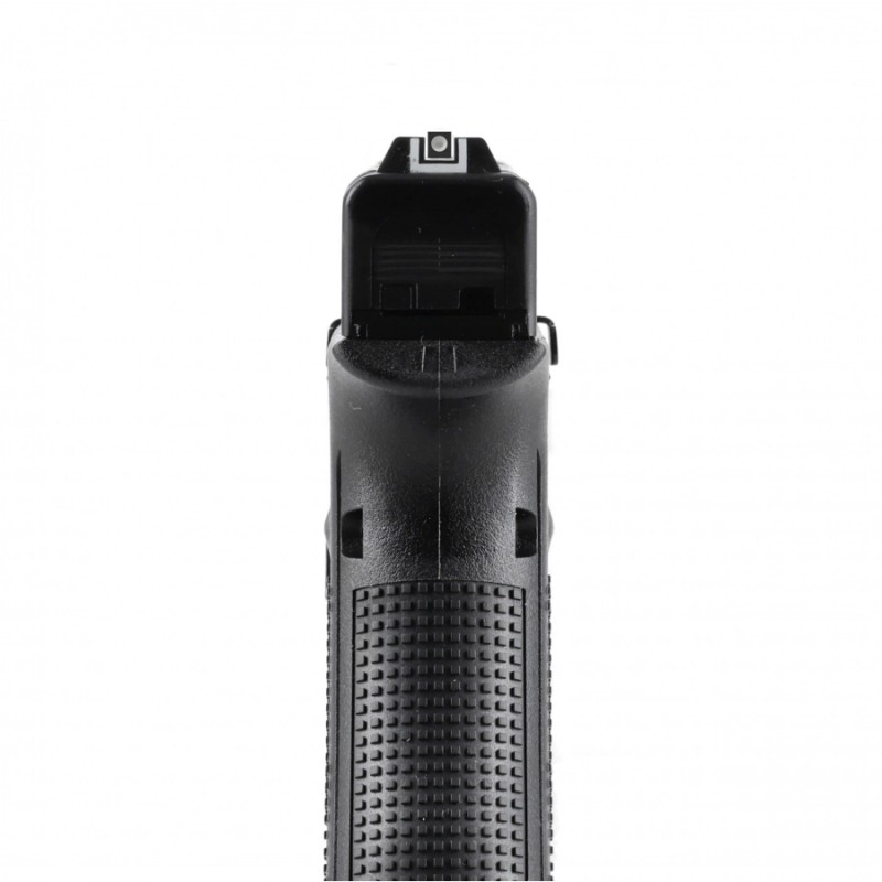 Glock 19 Gen 5 MOS posiada wysokiej jakości przyrządy celownicze, składające się z muszki i szczerbinki z białymi oznaczeniami, które ułatwiają celowanie w słabym oświetleniu. Dodatkowo, antypoślizgowa faktura rękojeści oraz ergonomiczny kształt zapewniają pewny chwyt i wygodę obsługi. To doskonały wybór zarówno dla miłośników realizmu, jak i dla osób poszukujących solidnej wiatrówki do rekreacyjnego strzelania.