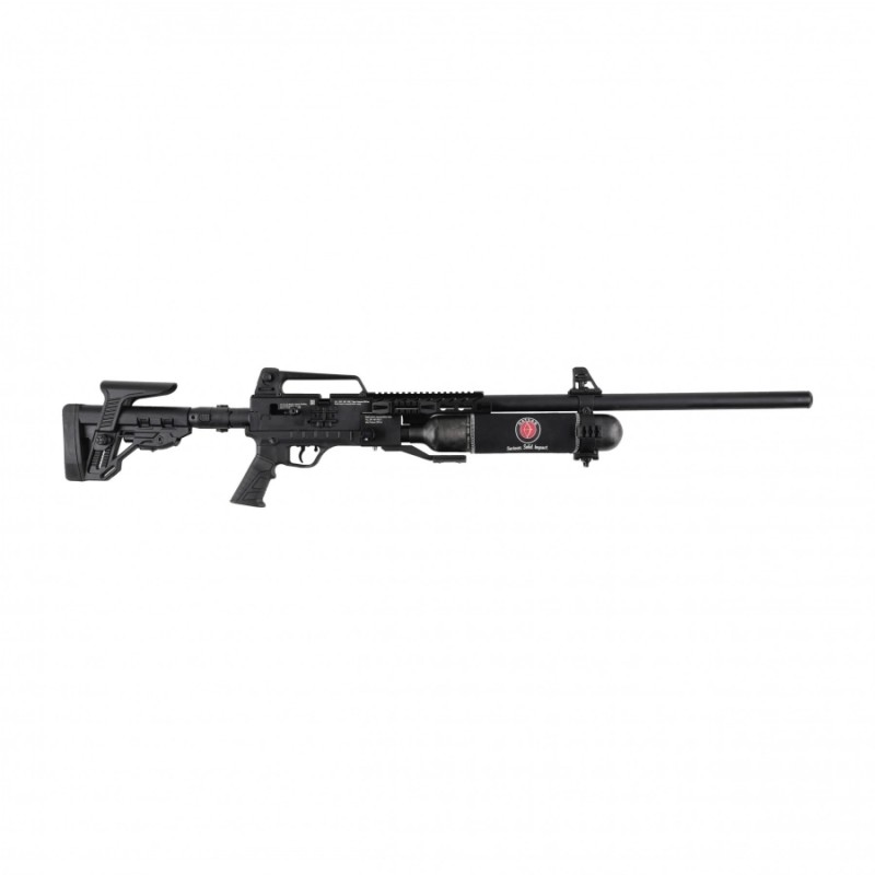 Dzięki dużej pojemności kartusza ładowany jest wyłącznie z butli technicznej lub nurkowej (300 bar) - to rozwiązanie stworzone z myślą o maksymalnej wydajności i pełnym wykorzystaniu potencjału broni.